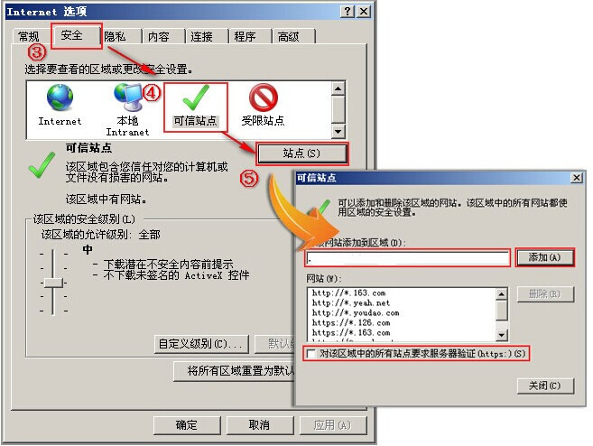 ⑤在“可信站點”的設置中,點擊“站點”,在彈出的站點窗口中輸入我們的網址如“http://