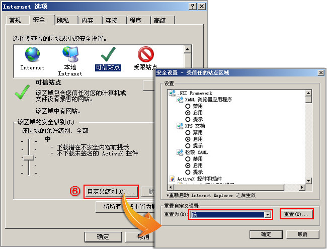 ⑥在“可信站點”的設置中,點擊“自定義級別”,在彈出的自定義窗口中,將“重置自定義設置”的安全級別調為“低”,點擊按鍵“重置”,然后點擊“確定”關閉自定義窗口。